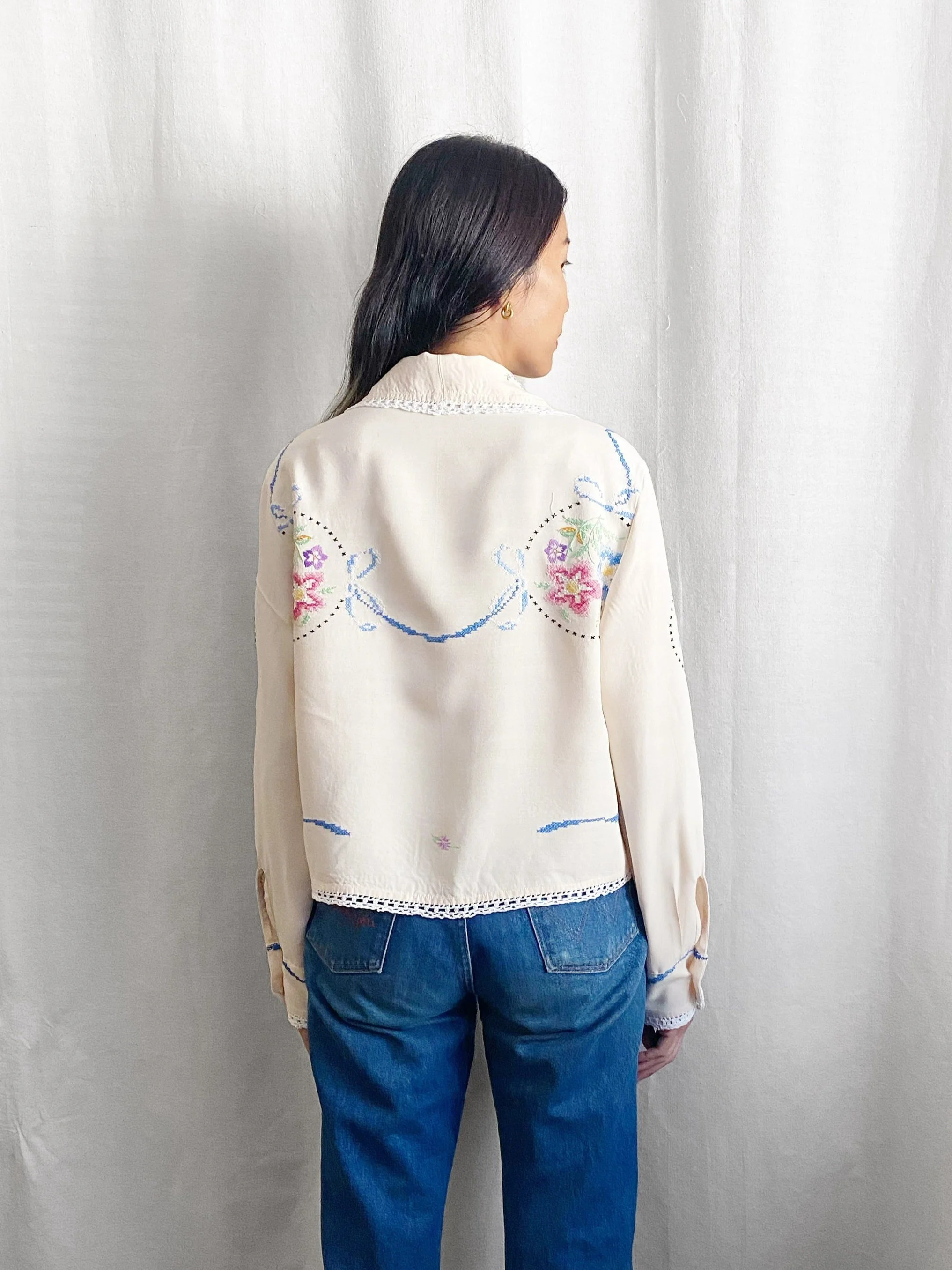 Fabric: Vintage 1950s hand embroidered cross-stitched tablecloth in cream with a hint of peach tone, very drapery. She also has a beautiful hand crochet lace detail on the edge, feminine look!