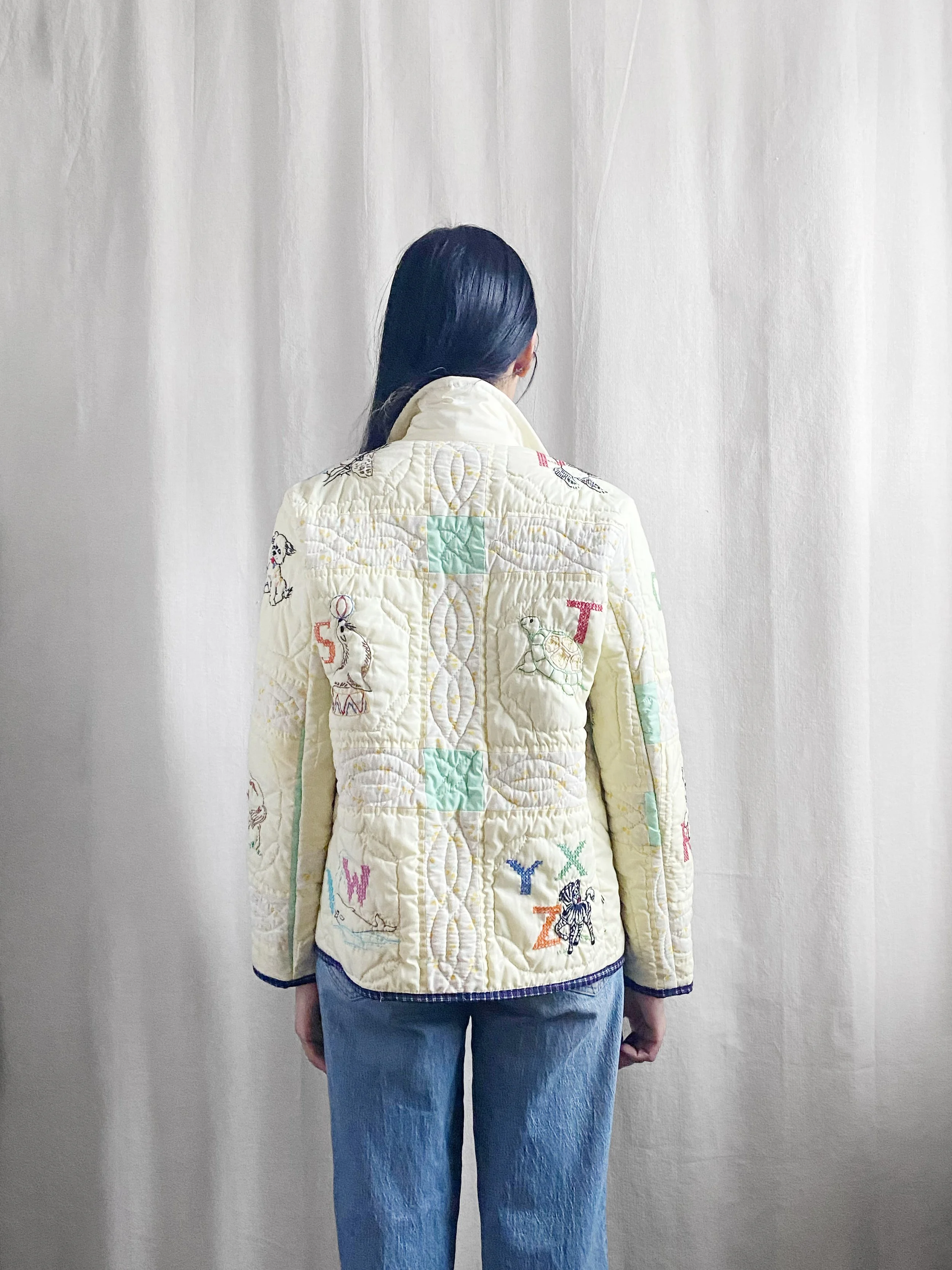 Fabric: Vintage 1990s hand embroidered alphabets quilt in yellow, white, green turquois. She is in an excellent condition with intricate details.