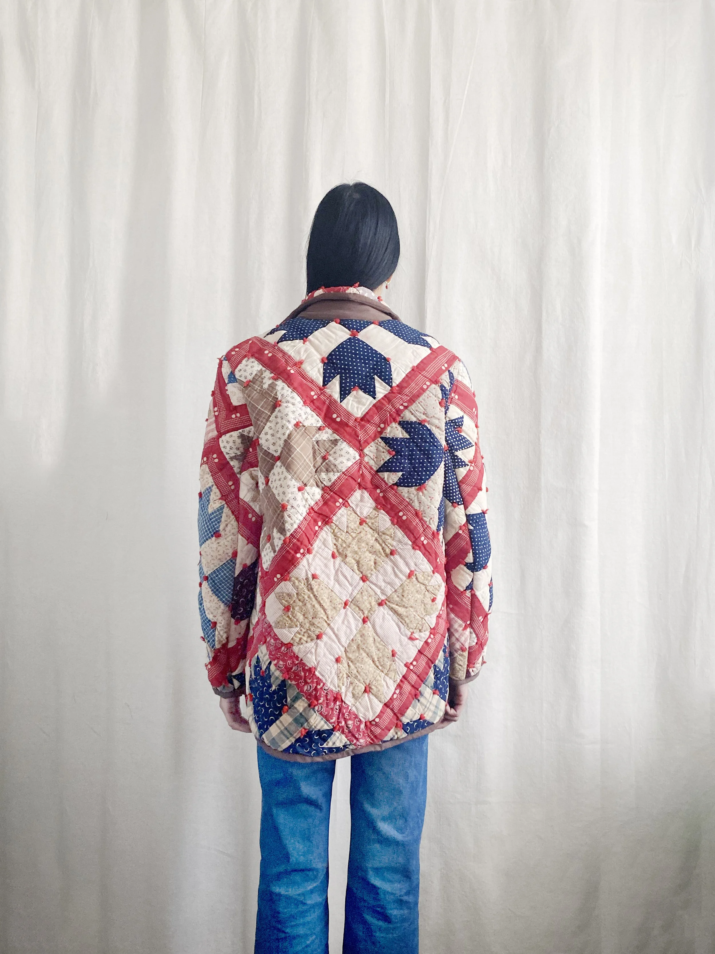Inspired by men's workwear chore jacket silhouette. Features a long boxy cut, relaxed to oversized fit, extra long sleeves, pointed collar, playful pocket details - heart pocket at the right hip, rounded corner rectangle pocket at the left hip. Piping details interior with vintage mixed match buttons.